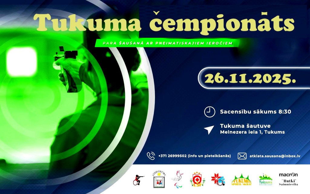 2025.gada 26.novembrī Tukumā, Sporta skolas šautuvē, Melnezera ielā 1 norisinājās Tukuma čempionāts 2025 ložu šaušanā ar pneimatiskajiem ieročiem - cilvēkiem ar invaliditāti. Sacensībās piedalījās para sportisti no Latvijas un Lietuvas, sacenšoties pistoles un šautenes disciplīnās SH1 un SH2 klasēs. Turnīrs pulcēja gan pieredzējušus šāvējus, gan sportistus, kas aktīvi attīstās savās disciplīnās.